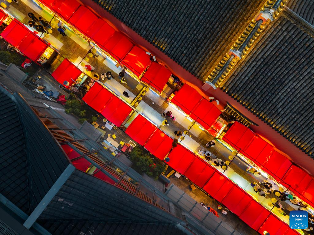 A drone photo shows people visiting a night market in Ningbo, east China's Zhejiang Province, Jan. 18, 2025. Lanterns and light installations have been arranged across China for the upcoming Spring Festival, or the Chinese Lunar New Year, which falls on Jan. 29 this year. (Photo by Hu Xuejun/Xinhua)