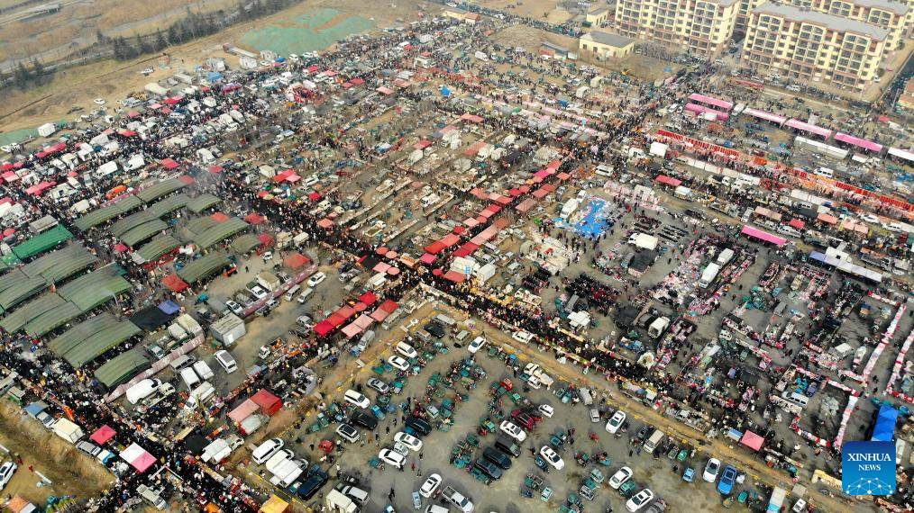 An aerial drone photo shows the Poli Market in Qingdao Xihai'an (West Coast) New Area in Qingdao, east China's Shandong Province, Jan. 18, 2025. With a history of more than 300 years, the Poli Market is a local intangible cultural heritage and one of the biggest traditional markets in eastern Shandong Province. As the Spring Festival approaches, many visitors flock to the market for abundant new year decorations, agricultural products, local delicacies and so on. (Xinhua/Li Ziheng)