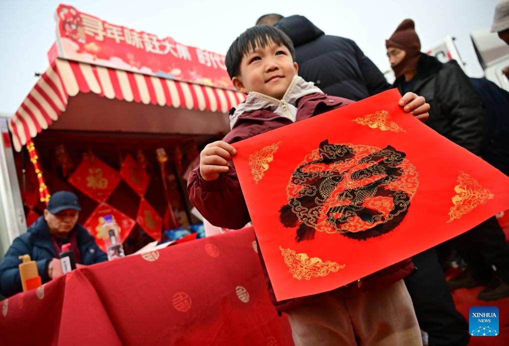 A boy receives a calligraphy work of Chinese character "Fu", which means "good fortune", at the Poli Market in Qingdao Xihai'an (West Coast) New Area in Qingdao, east China's Shandong Province, Jan. 18, 2025. With a history of more than 300 years, the Poli Market is a local intangible cultural heritage and one of the biggest traditional markets in eastern Shandong Province. As the Spring Festival approaches, many visitors flock to the market for abundant new year decorations, agricultural products, local delicacies and so on. (Xinhua/Li Ziheng)