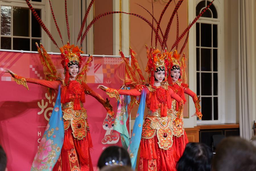 Artists perform opera and dance during the Snake "Happy Spring Festival" New Year Celebration Gala and Spring Festival Reception at the Red City Hall in Berlin, Germany, Jan. 17, 2025. (Xinhua/Tai Sicong)
