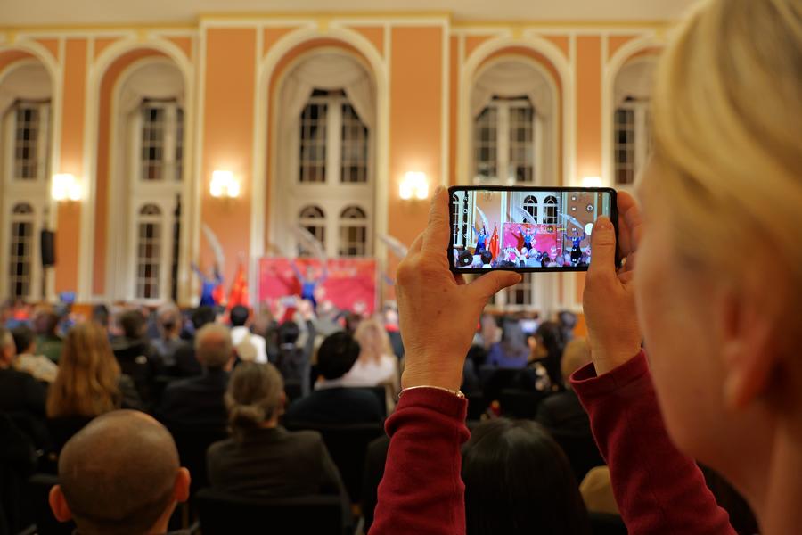 A guest takes photos during the 2025 Year of the Snake "Happy Spring Festival" New Year Celebration Gala and Spring Festival Reception at Berlin's Red City Hall in Berlin, Germany, on Jan. 17, 2025. (Xinhua/Tai Sicong)