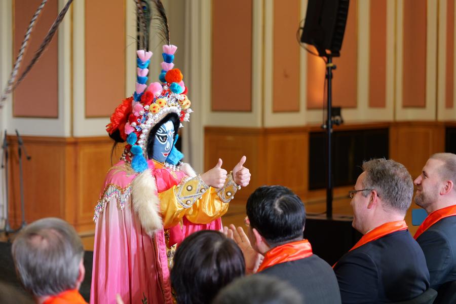 A Sichuan Opera artist performs face changing stunt during the Snake "Happy Spring Festival" New Year Celebration Gala and Spring Festival Reception at the Red City Hall in Berlin, Germany, Jan. 17, 2025. (Xinhua/Tai Sicong)