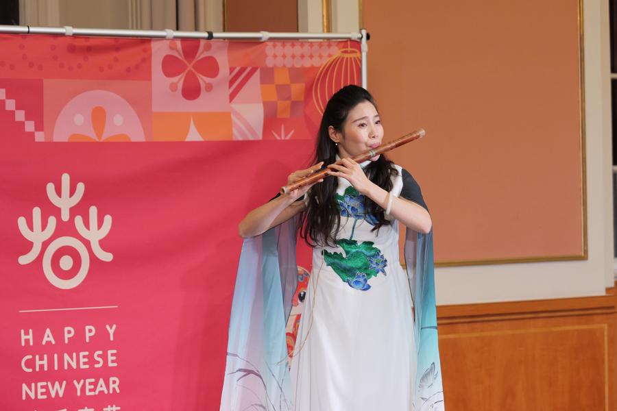 An artist plays bamboo flute during the Snake "Happy Spring Festival" New Year Celebration Gala and Spring Festival Reception at the Red City Hall in Berlin, Germany, Jan. 17, 2025. (Xinhua/Tai Sicong)