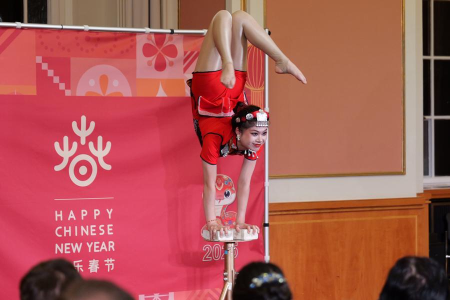 An acrobat performs during the Snake "Happy Spring Festival" New Year Celebration Gala and Spring Festival Reception at the Red City Hall in Berlin, Germany, Jan. 17, 2025. (Xinhua/Tai Sicong)