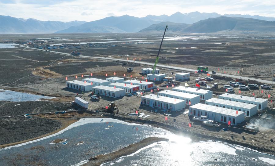An aerial drone photo shows the construction of makeshift houses in Chamco Township, Dingri County in Xigaze, southwest China's Xizang Autonomous Region, Jan. 15, 2025. (Xinhua/Tenzin Nyida)