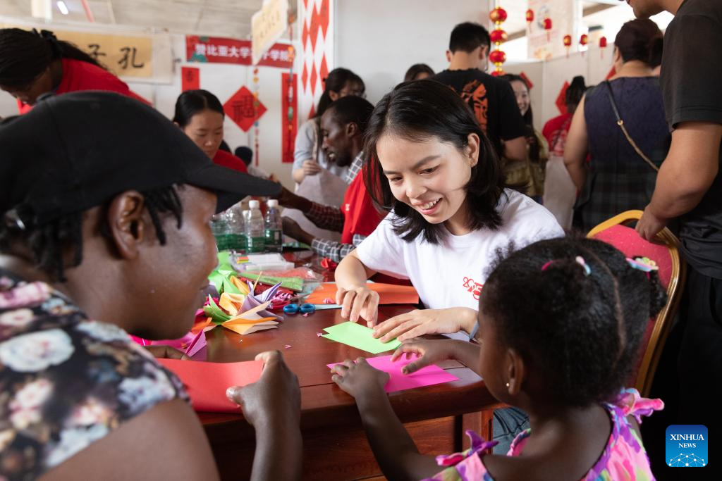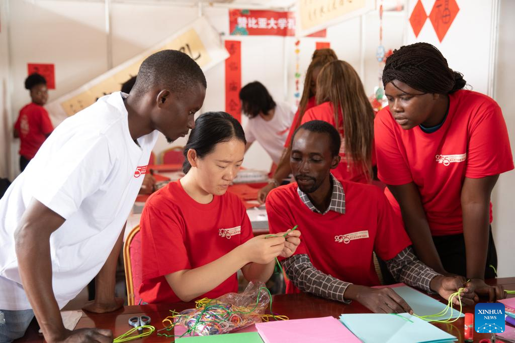 A teacher from the Confucius Institute at the University of Zambia teaches students to make Chinese knots during the 2025 Zambia-Chinese Spring Festival Temple Fair in Lusaka, Zambia, Jan. 19, 2025. (Xinhua/Peng Lijun)