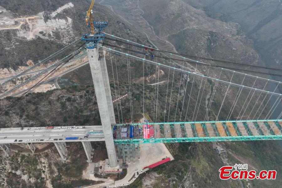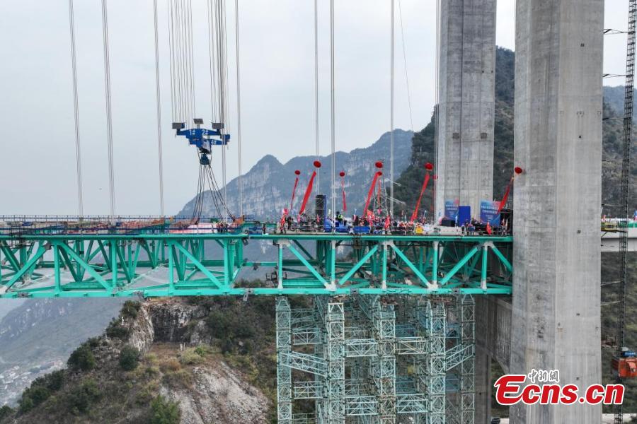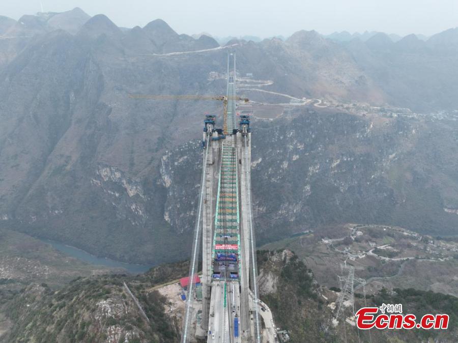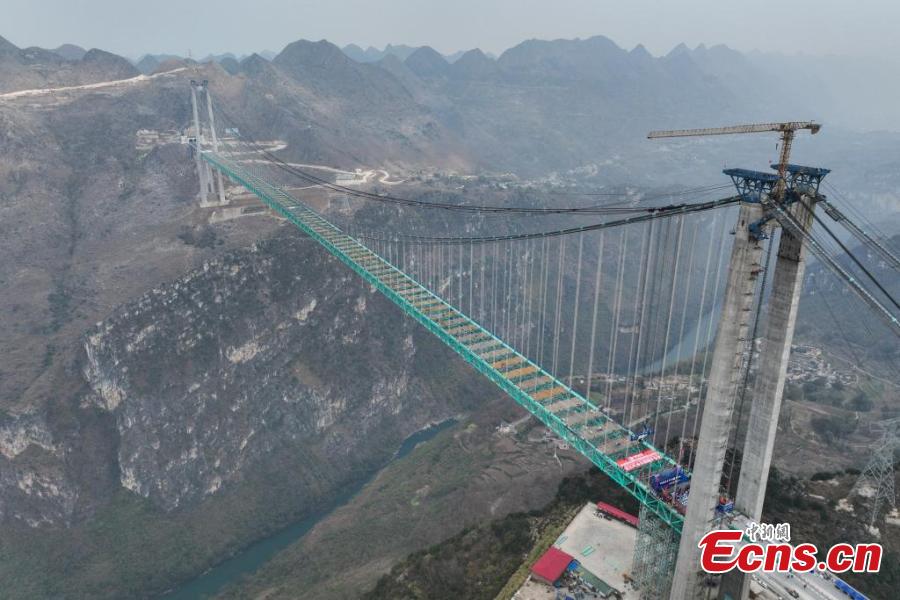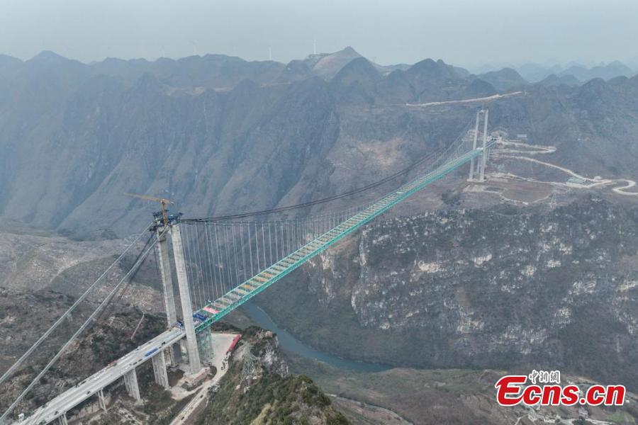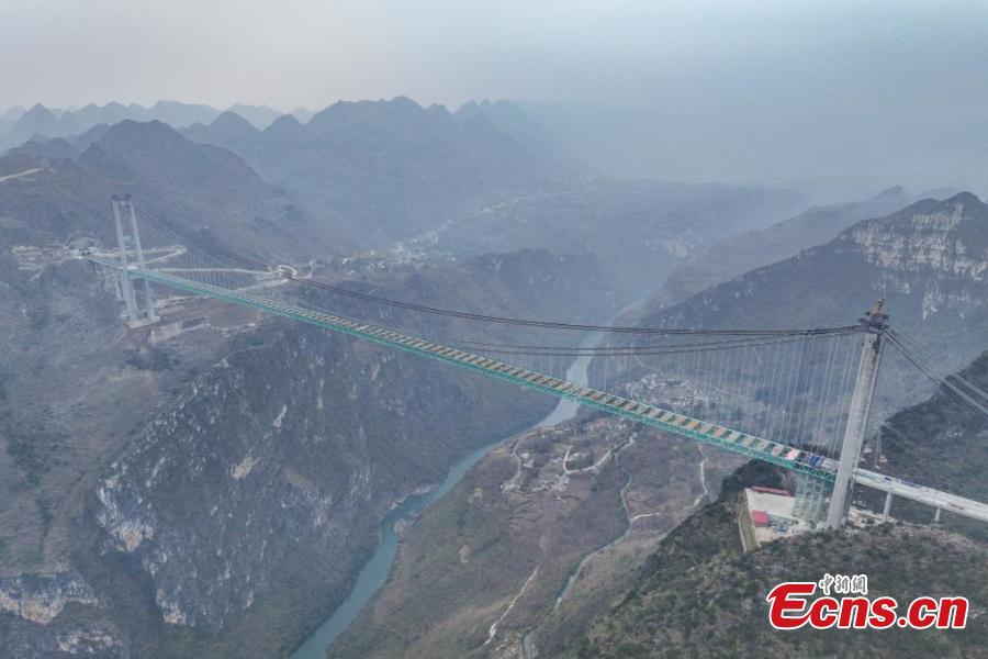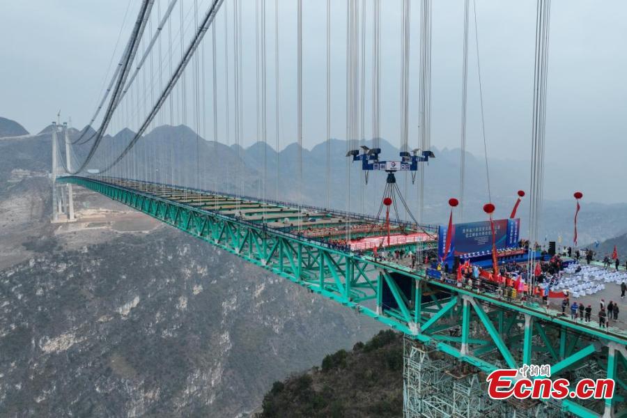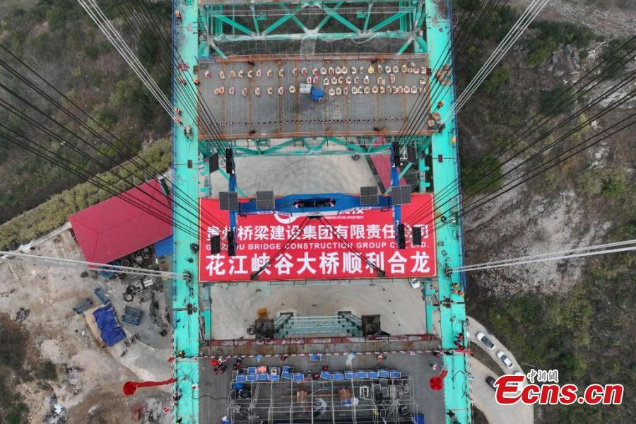 The Huajiang Grand Canyon Bridge was connected on Friday. With a designed deck height of 625 meters and a main span of 1,420 meters, the bridge surpasses the Beipanjiang Bridge that measures 565 meters in height on the expressway linking Hangzhou in Zhejiang Province and Ruili in Yunnan Province as the new highest bridge in the world.