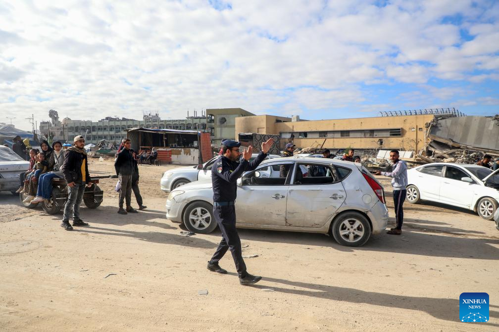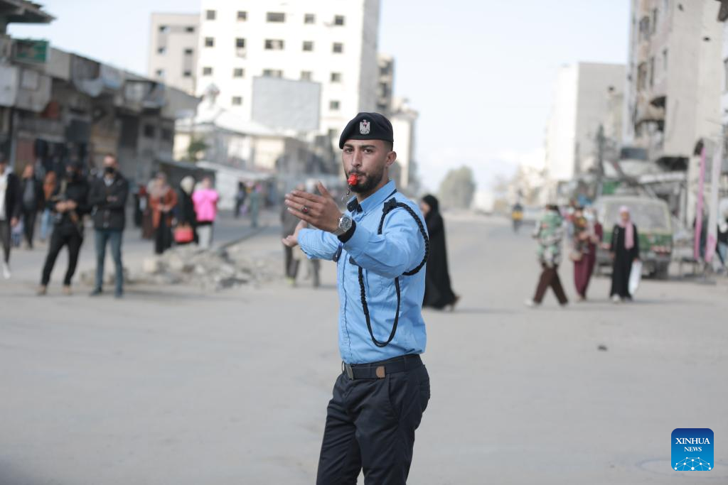 A member of the Palestinian Hamas police directs traffic on a street in the southern Gaza Strip city of Khan Younis, on Jan. 20, 2025. Gaza's Hamas-run interior ministry said Saturday in a statement that its security forces will begin deploying across the Gaza Strip as soon as the ceasefire-for-hostage release deal takes effect on Sunday. (Photo by Rizek Abdeljawad/Xinhua)