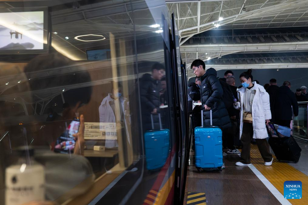 Passengers board a train at Wuhan Railway Station in Wuhan, central China's Hubei Province, Jan. 20, 2025. As this year's Spring Festival travel rush began on Jan. 14, China Railway Wuhan Bureau Group Co., Ltd. has scheduled to add 47 overnight high-speed trains daily towards major cities from Jan. 20 to 27, in an effort to better cater for passengers. (Xinhua/Wu Zhizun)
