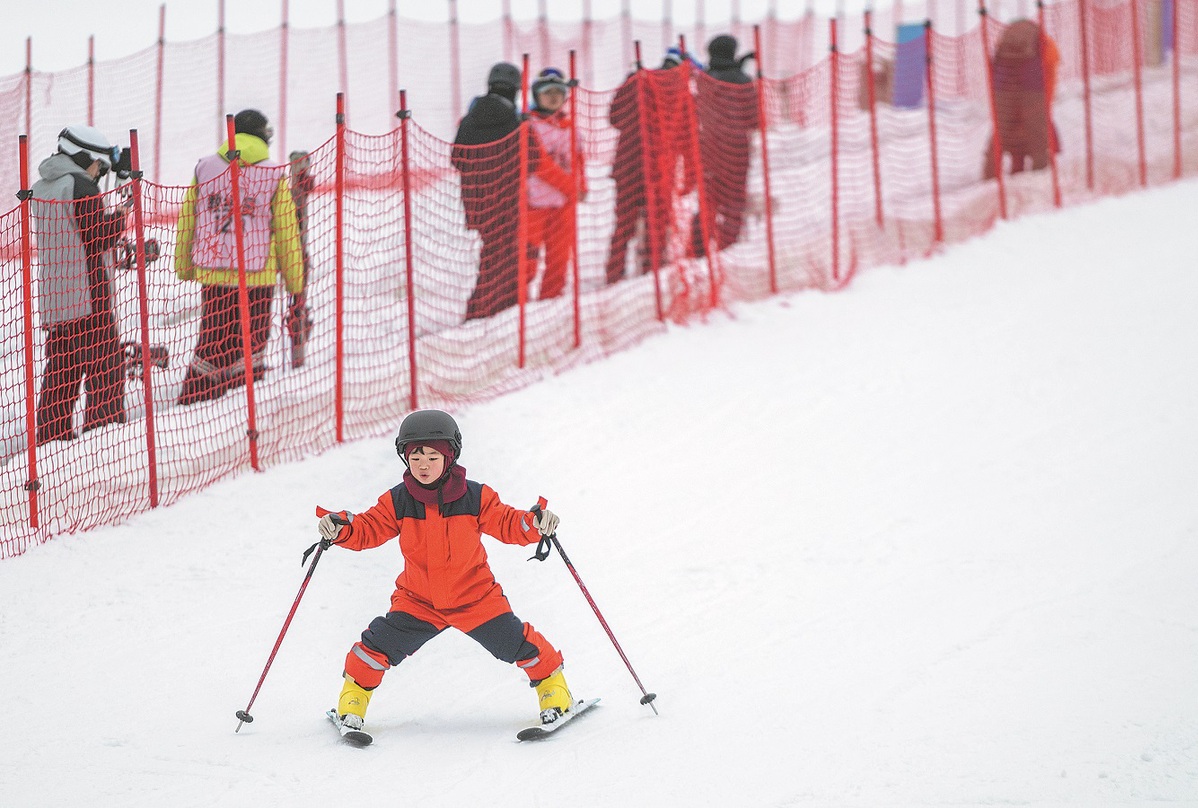 A child skis at the Lyucongpo Ski Resort in Badong, a county in Hubei province, on Feb 26. (Hu Jingwen/Xinhua)
