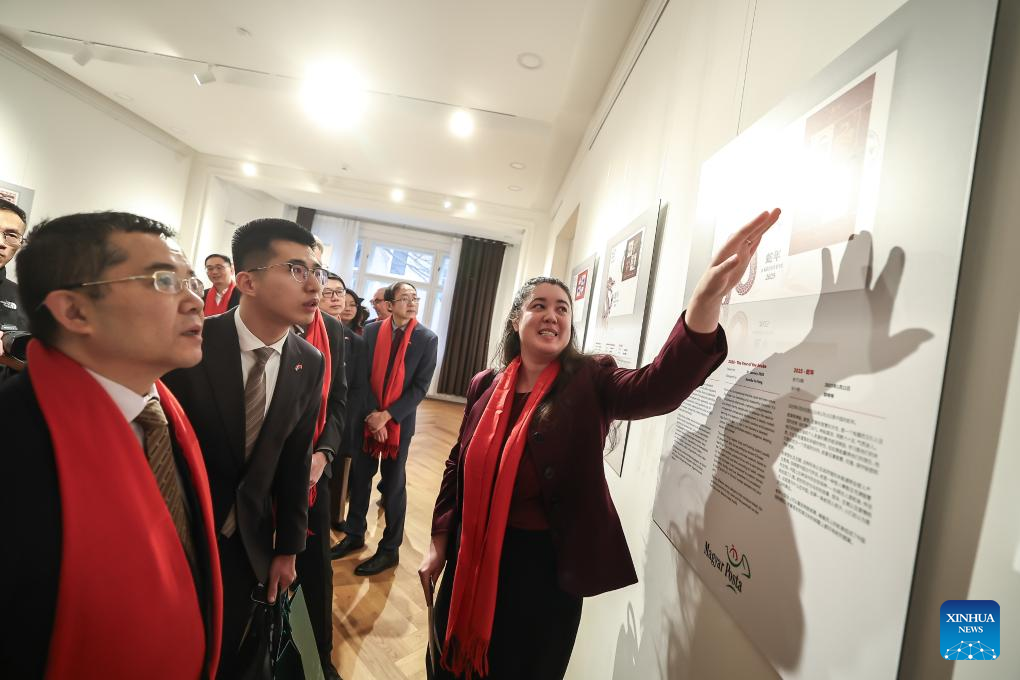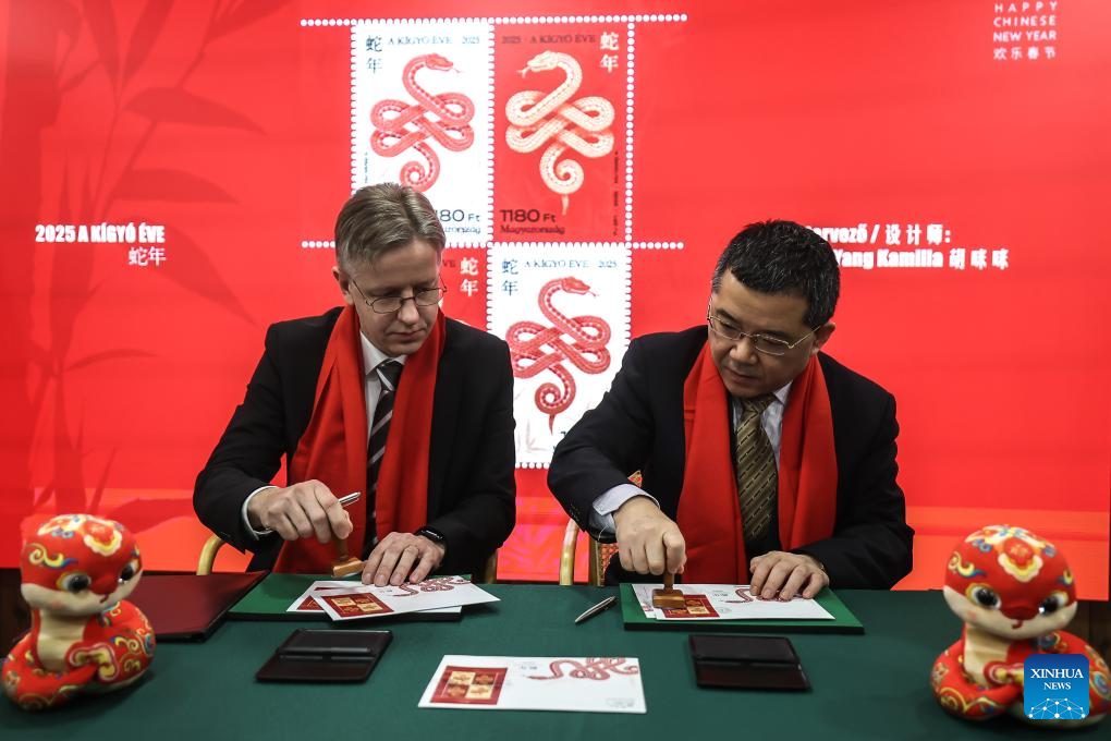 BUDAPEST, Jan. 21 (Xinhua) -- A commemorative sheet of postage stamps celebrating the upcoming Chinese Lunar New Year, the Year of the Snake, was unveiled on Tuesday at the China Cultural Center in Budapest, Hungary.