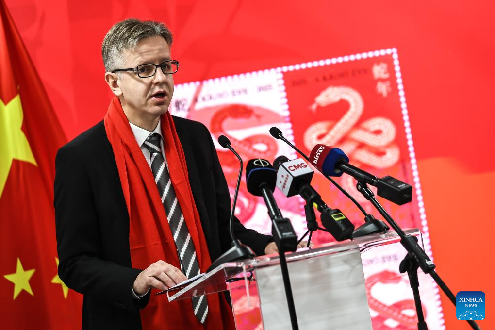 Hungarian Deputy State Secretary for State Assets Geza Lang speaks during a launch ceremony of the Year of the Snake stamp in Budapest, Hungary, on Jan. 21, 2025. A commemorative sheet of postage stamps celebrating the upcoming Chinese Lunar New Year, the Year of the Snake, was unveiled on Tuesday at the China Cultural Center in Budapest, Hungary. (Photo by David Balogh/Xinhua)