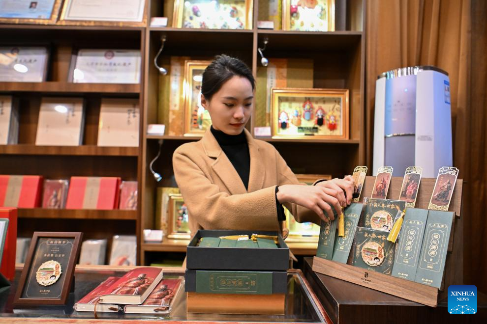 A salesperson of a store focusing on "Clay Figure Zhang", a clay sculpture art, arranges creative cultural products on an ancient cultural street in north China's Tianjin Municipality, Jan. 20, 2025. "Clay Figure Zhang" is one of the representatives of clay sculpture art in northern China. In 2006, it was listed in the first batch of national intangible cultural heritage. As the Spring Festival draws near, "Clay Figure Zhang" in Tianjin has rolled out many festive-themed clay sculptures, as well as various creative cultural products, to better meet the consumption needs. (Xinhua/Sun Fanyue)