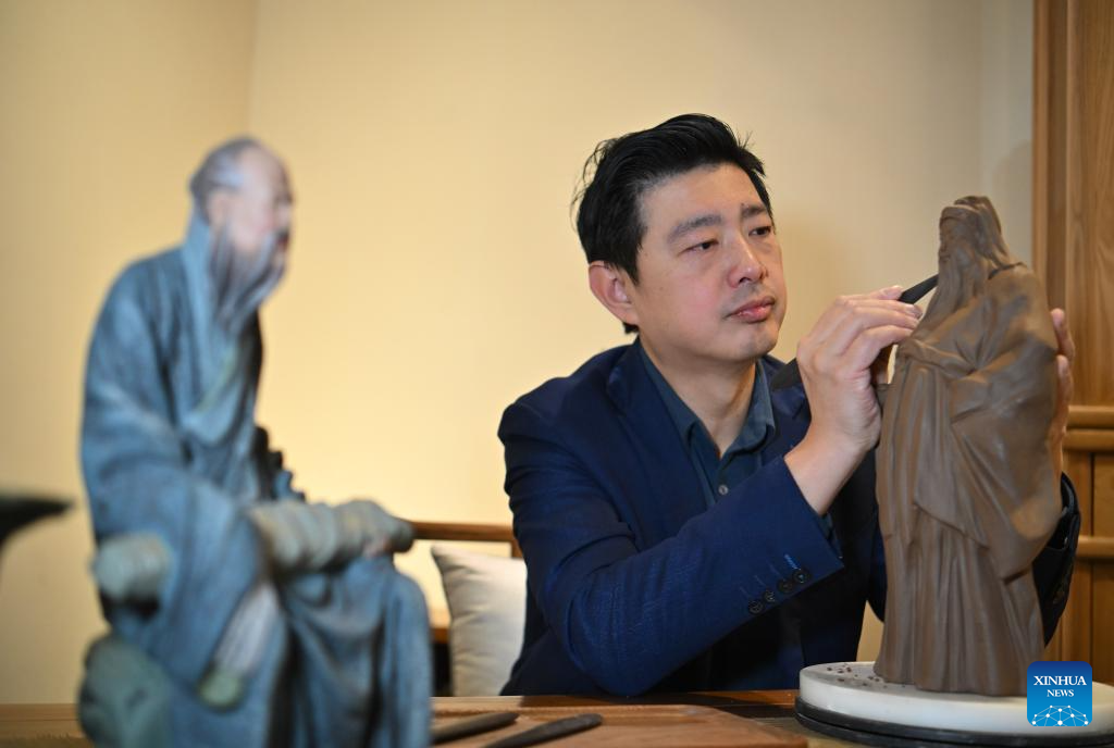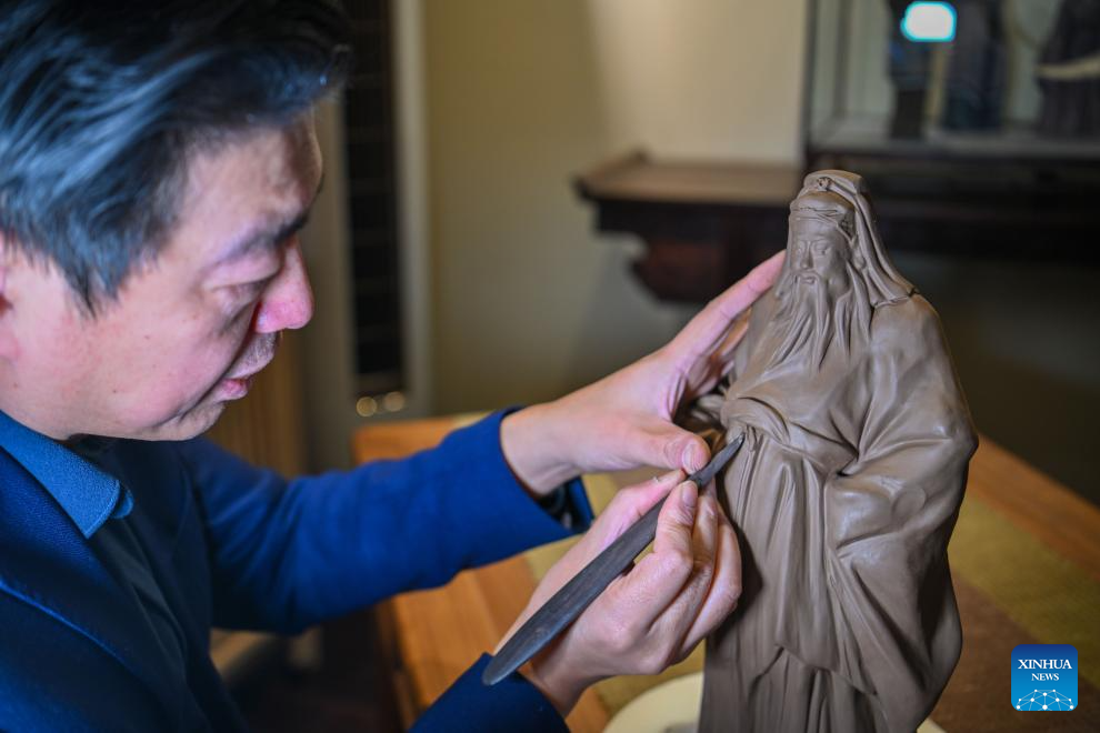 Zhang Yu, the sixth generation inheritor of "Clay Figure Zhang", a clay sculpture art, kneads a new figurine at Clay Figure Zhang Art Gallery in north China's Tianjin Municipality, Jan. 20, 2025. "Clay Figure Zhang" is one of the representatives of clay sculpture art in northern China. In 2006, it was listed in the first batch of national intangible cultural heritage. As the Spring Festival draws near, "Clay Figure Zhang" in Tianjin has rolled out many festive-themed clay sculptures, as well as various creative cultural products, to better meet the consumption needs. (Xinhua/Sun Fanyue)