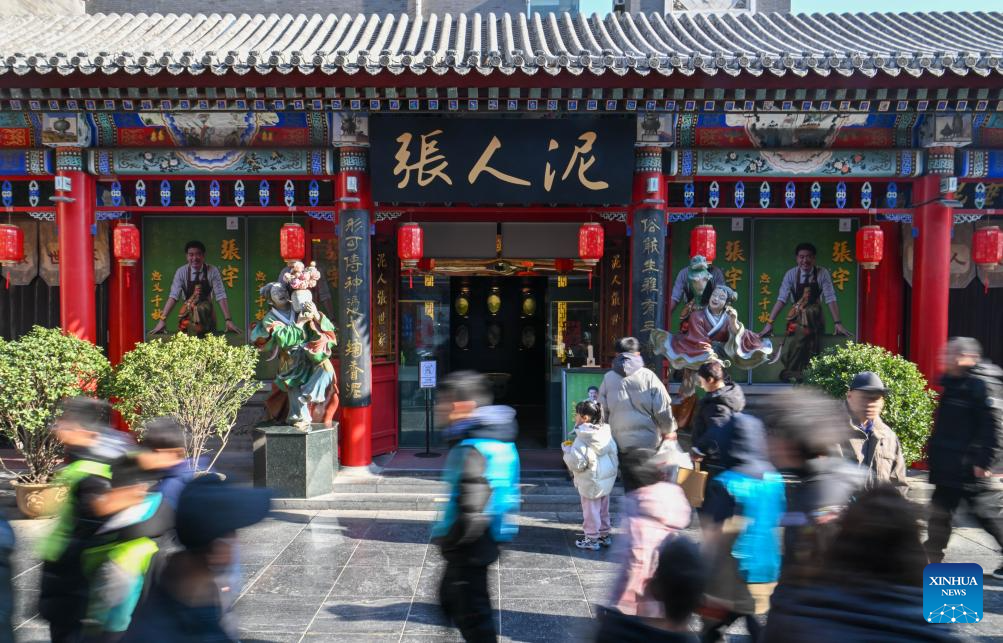 Tourists walk past a store focusing on "Clay Figure Zhang", a clay sculpture art, on an ancient cultural street in north China's Tianjin Municipality, Jan. 20, 2025. "Clay Figure Zhang" is one of the representatives of clay sculpture art in northern China. In 2006, it was listed in the first batch of national intangible cultural heritage. As the Spring Festival draws near, "Clay Figure Zhang" in Tianjin has rolled out many festive-themed clay sculptures, as well as various creative cultural products, to better meet the consumption needs. (Xinhua/Sun Fanyue)