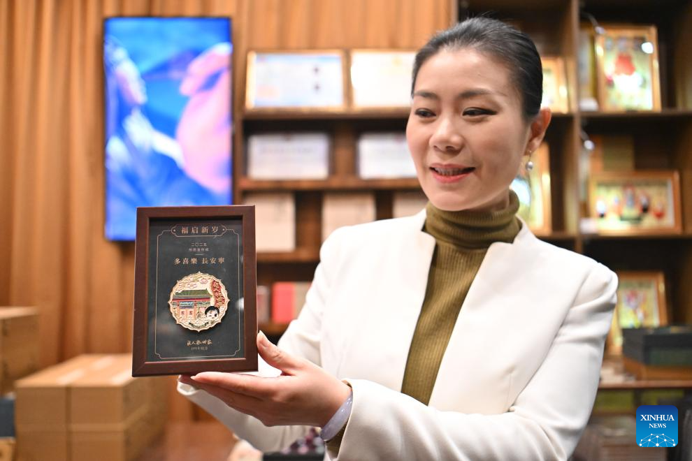 A merchant of a store focusing on "Clay Figure Zhang", a clay sculpture art, displays a cultural product with the theme of Chinese Lunar New Year on an ancient cultural street in north China's Tianjin Municipality, Jan. 20, 2025. "Clay Figure Zhang" is one of the representatives of clay sculpture art in northern China. In 2006, it was listed in the first batch of national intangible cultural heritage. As the Spring Festival draws near, "Clay Figure Zhang" in Tianjin has rolled out many festive-themed clay sculptures, as well as various creative cultural products, to better meet the consumption needs. (Xinhua/Sun Fanyue)