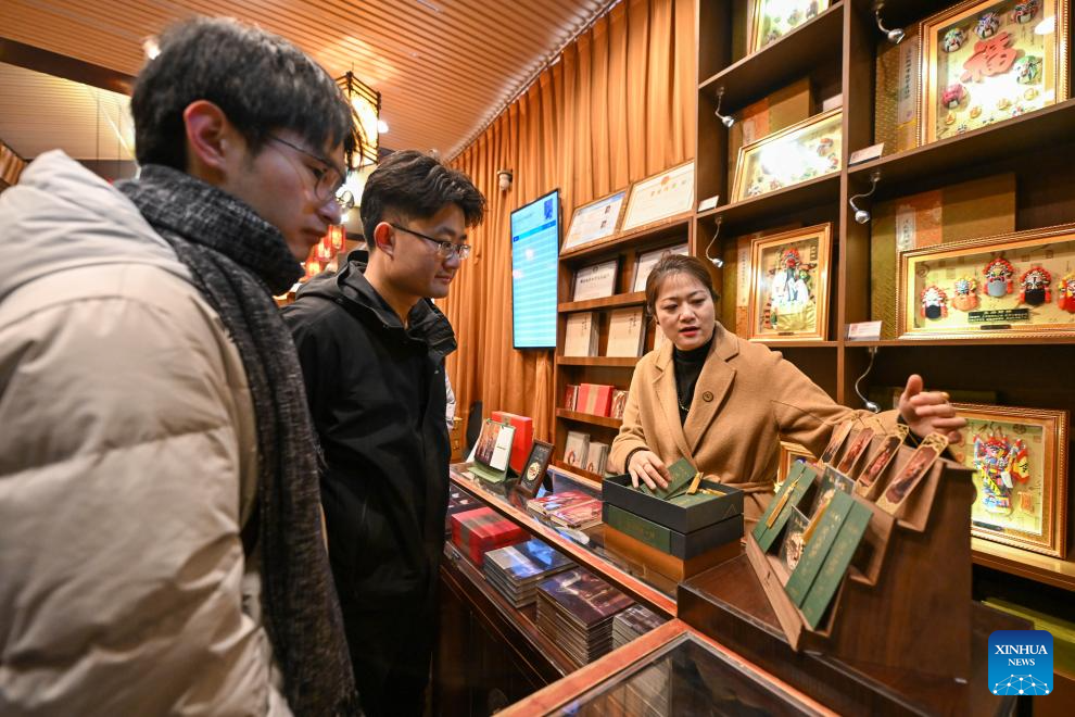 Tourists shop for creative cultural products at a store focusing on "Clay Figure Zhang", a clay sculpture art, on an ancient cultural street in north China's Tianjin Municipality, Jan. 20, 2025. "Clay Figure Zhang" is one of the representatives of clay sculpture art in northern China. In 2006, it was listed in the first batch of national intangible cultural heritage. As the Spring Festival draws near, "Clay Figure Zhang" in Tianjin has rolled out many festive-themed clay sculptures, as well as various creative cultural products, to better meet the consumption needs. (Xinhua/Sun Fanyue)