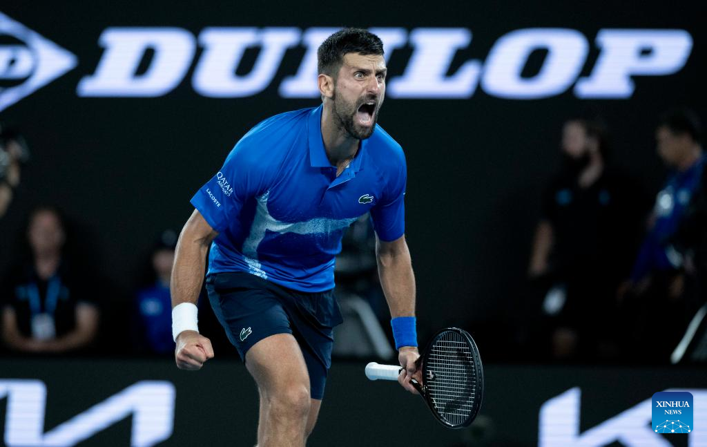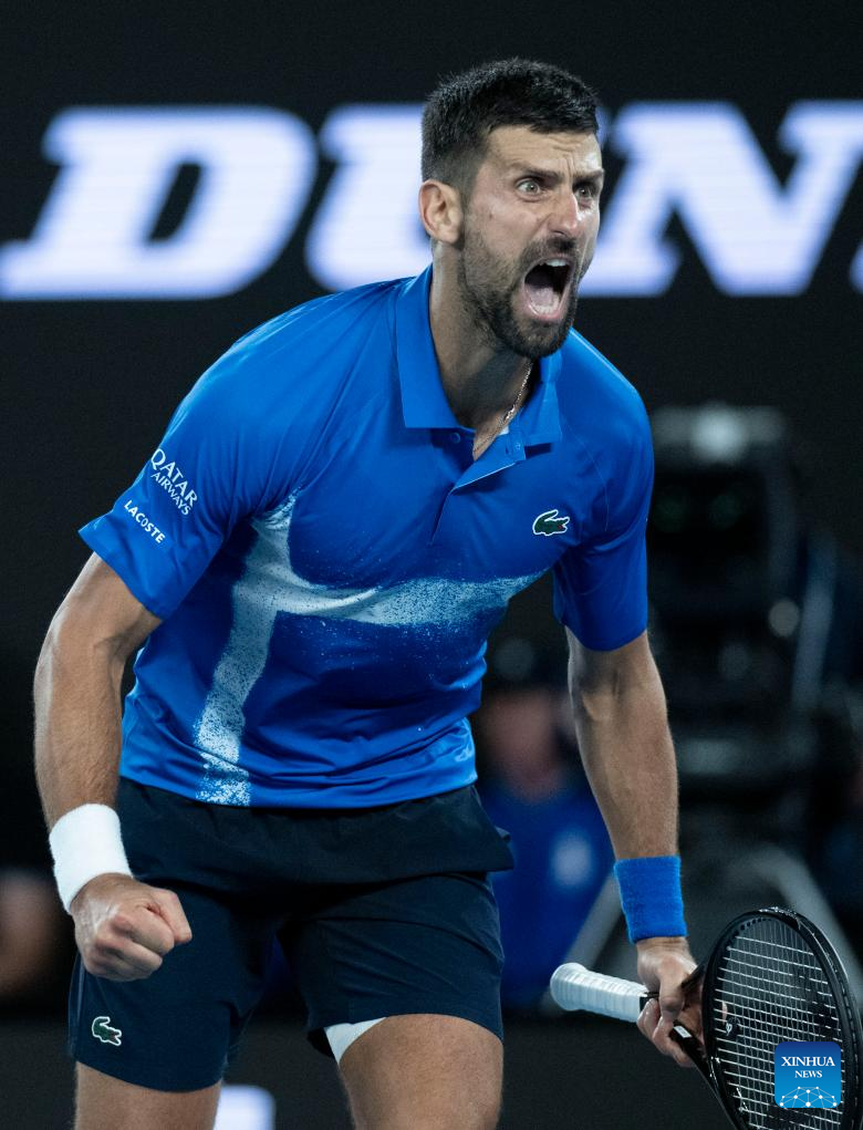 MELBOURNE, Jan. 21 (Xinhua) -- Novak Djokovic overcame an injury scare and staged a remarkable resurrection to defeat third seed Carlos Alcaraz on Tuesday, while defending women's champion Aryna Sabalenka battled into the Australian Open semifinals.