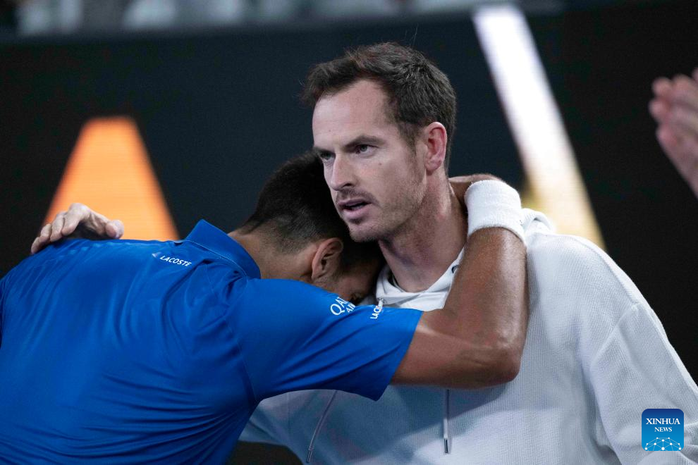 Novak Djokovic (L) hugs his coach Andy Murray after the men's singles quarterfinal between Novak Djokovic of Serbia and Carlos Alcaraz of Spain at Australian Open tennis tournament in Melbourne, Australia, Jan. 21, 2025. (Xinhua/Lui Siu Wai)