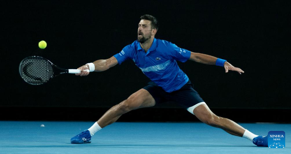 Novak Djokovic hits a return during the men's singles quarterfinal between Novak Djokovic of Serbia and Carlos Alcaraz of Spain at Australian Open tennis tournament in Melbourne, Australia, Jan. 21, 2025. (Xinhua/Lui Siu Wai)