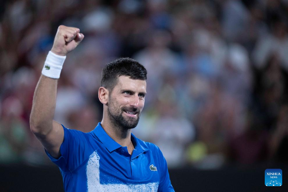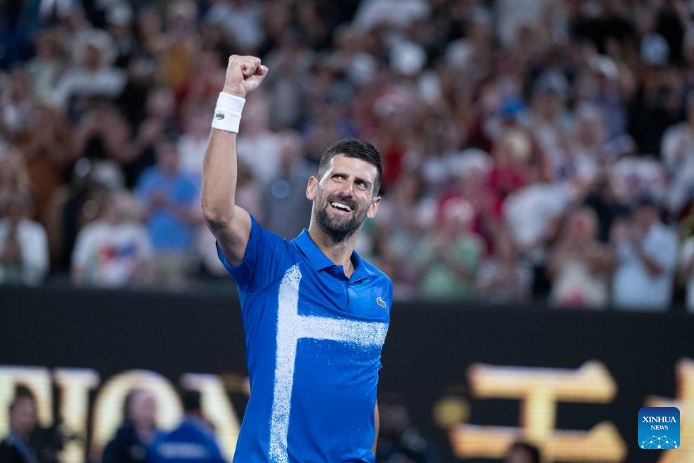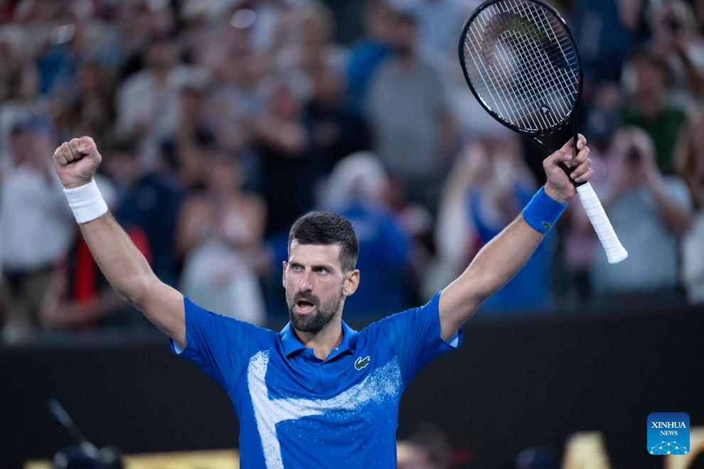 Novak Djokovic celebrates winning the men's singles quarterfinal between Novak Djokovic of Serbia and Carlos Alcaraz of Spain at Australian Open tennis tournament in Melbourne, Australia, Jan. 21, 2025. (Xinhua/Lui Siu Wai)