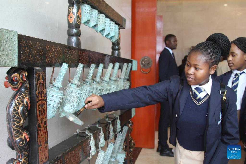 A Zimbabwean student attending the China-Zimbabwe Friendship Scholarship awarding ceremony rings a replica of an ancient Chinese chime bell at the Chinese embassy in Harare, Zimbabwe, on Jan. 21, 2025. A total of 52 Chinese language learners in Zimbabwe on Tuesday received scholarships under the China-Zimbabwe Friendship Scholarship program for academic excellence. (Xinhua/Tafara Mugwara)