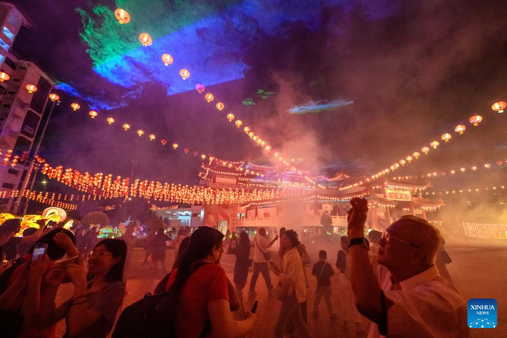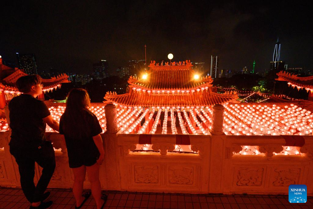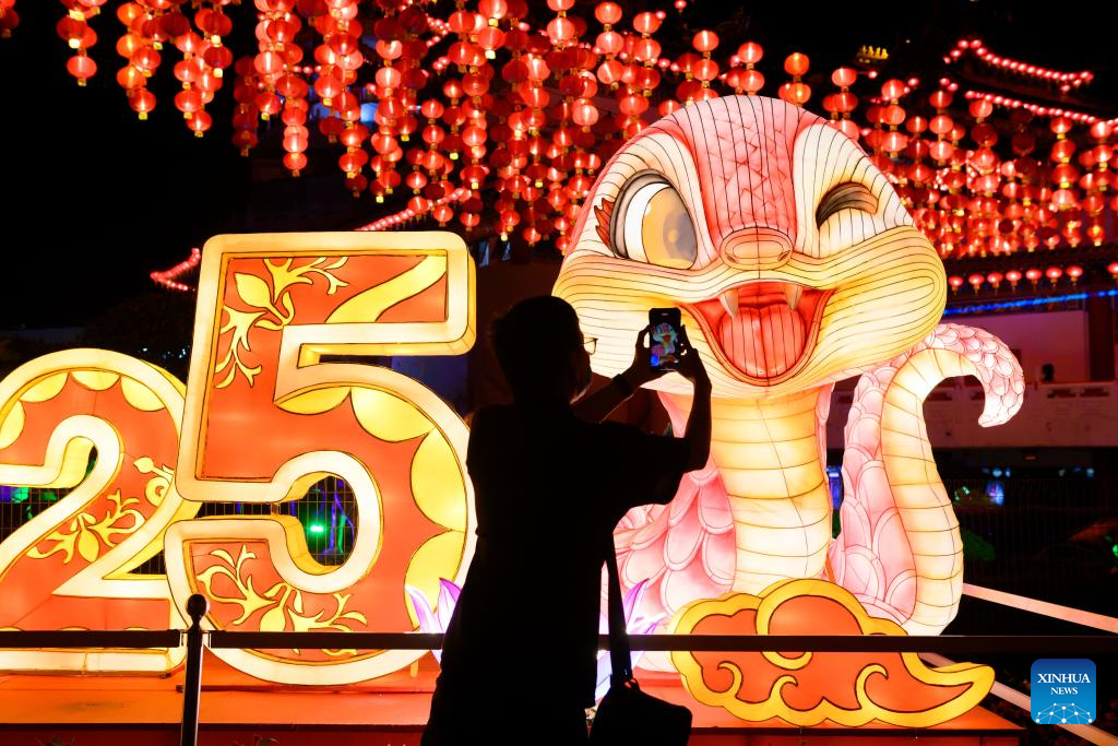 People view festive lanterns at the Thean Hou Temple in Kuala Lumpur, Malaysia, Jan. 21, 2025. A lighting ceremony was held here Tuesday to mark the upcoming Chinese New Year. (Xinhua/Chong Voon Chung)
