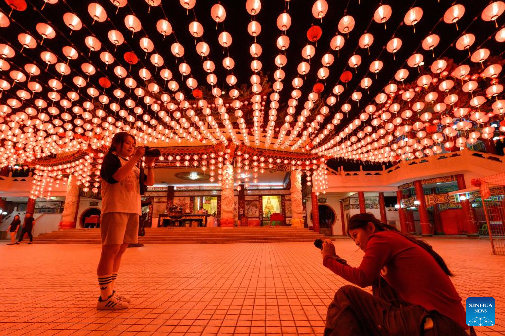 People take photos of festive lanterns at the Thean Hou Temple in Kuala Lumpur, Malaysia, Jan. 21, 2025. A lighting ceremony was held here Tuesday to mark the upcoming Chinese New Year. (Xinhua/Chong Voon Chung)