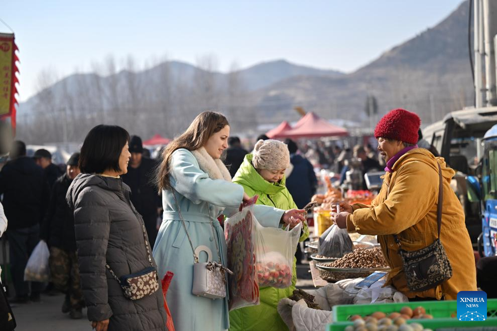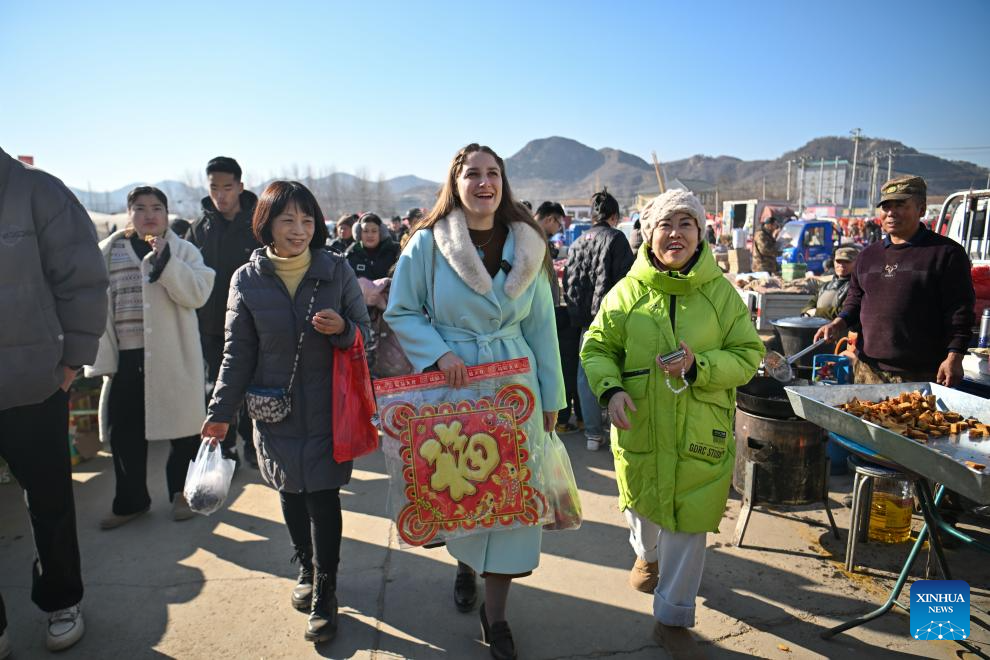 Sara Tentori (C) and her family members select Spring Festival goods at a market in Nanying Village, Guanzhuang Town, Jizhou District, north China's Tianjin, Jan. 19, 2025. (Xinhua/Sun Fanyue)