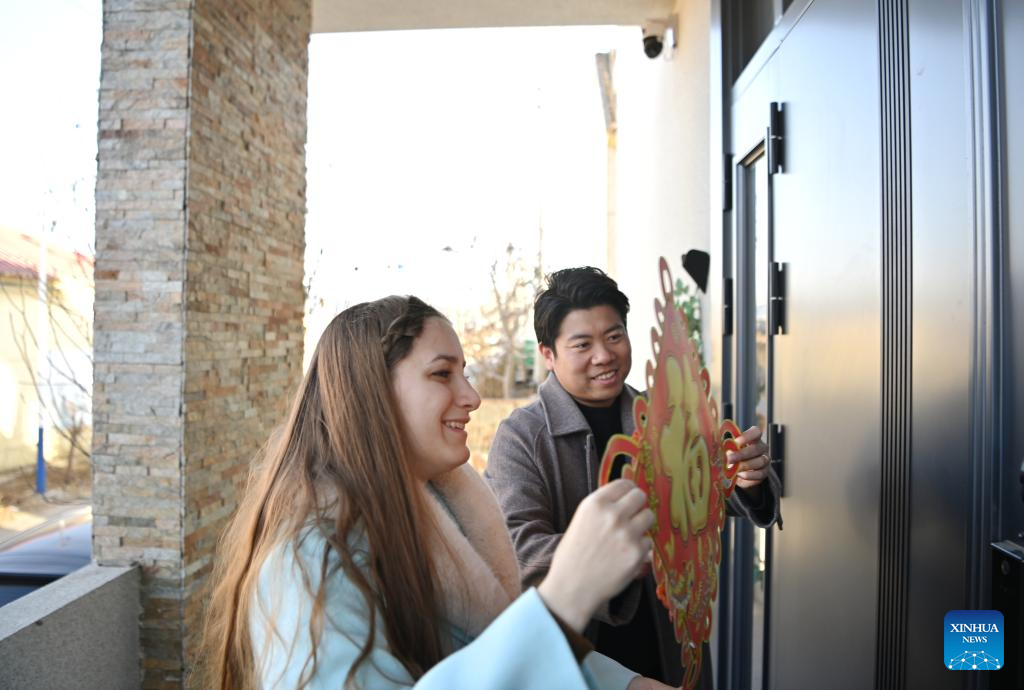 Sara Tentori and her husband Li Jian paste Chinese character "fu" (meaning happiness, blessing, and good fortune) on the front door in Nanying Village, Guanzhuang Town, Jizhou District, north China's Tianjin, Jan. 19, 2025. (Xinhua/Li Ran)