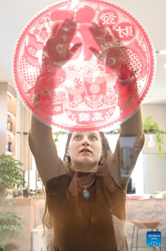 Sara Tentori pastes window paper-cut in Nanying Village, Guanzhuang Town, Jizhou District, north China's Tianjin, Jan. 19, 2025. (Xinhua/Li Ran)