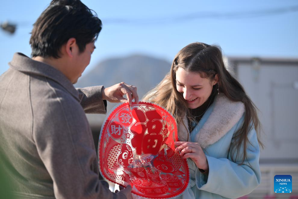 Sara Tentori and her husband Li Jian select a piece of window paper-cut at a Spring Festival market in Nanying Village, Guanzhuang Town, Jizhou District, north China's Tianjin, Jan. 19, 2025. (Xinhua/Li Ran)