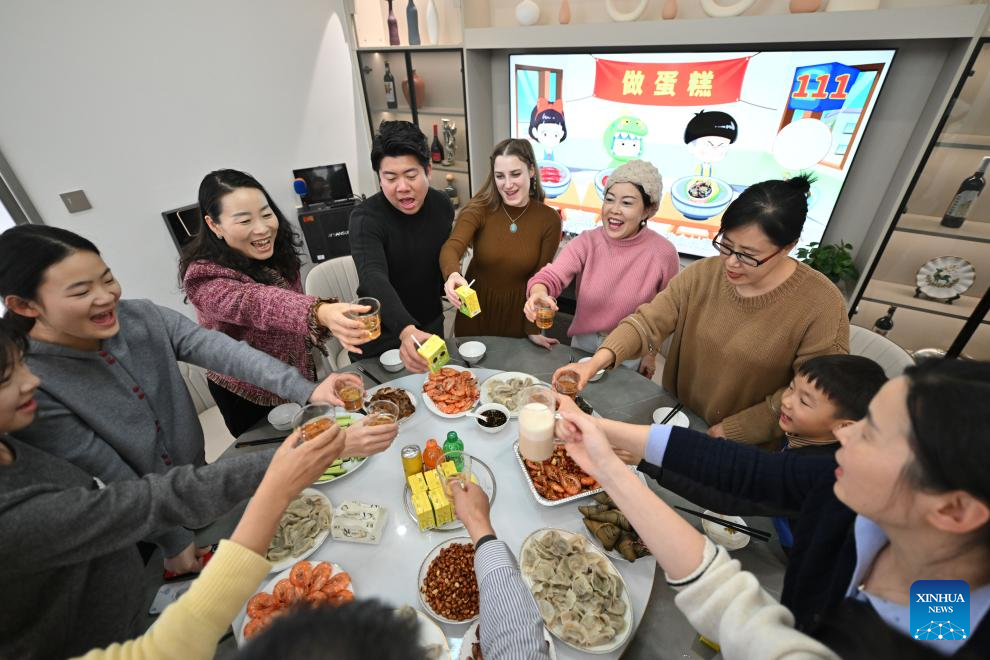 Sara Tentori (5th, R) toasts at a family party in Nanying Village, Guanzhuang Town, Jizhou District, north China's Tianjin, Jan. 19, 2025. (Xinhua/Sun Fanyue)