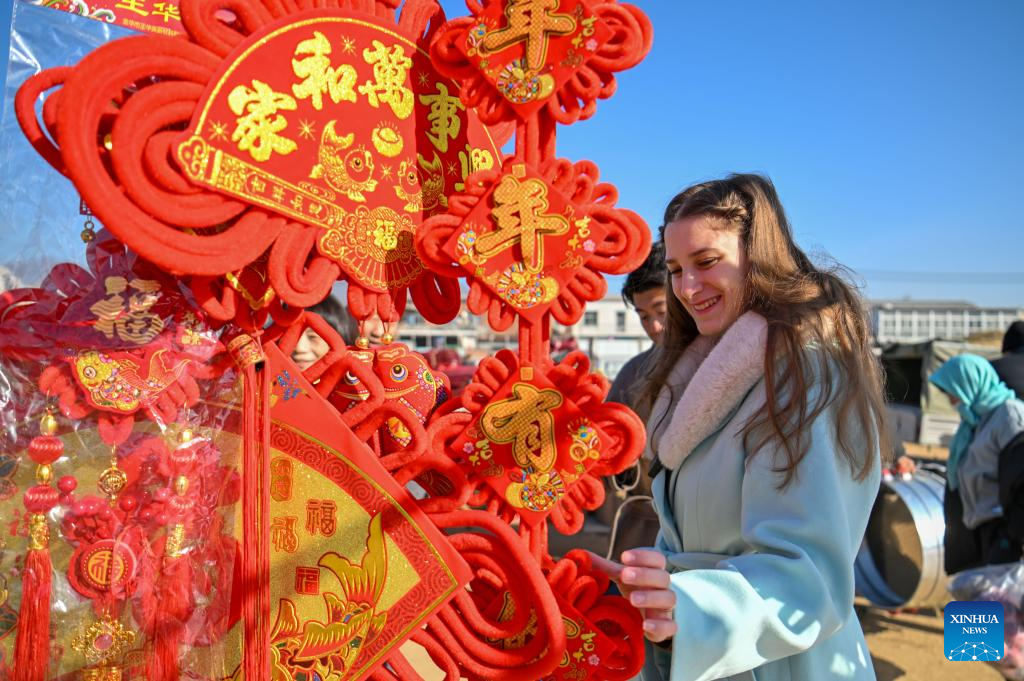 Sara Tentori selects Spring Festival goods at a market in Jizhou District, north China's Tianjin, Jan. 19, 2025. (Xinhua/Sun Fanyue)