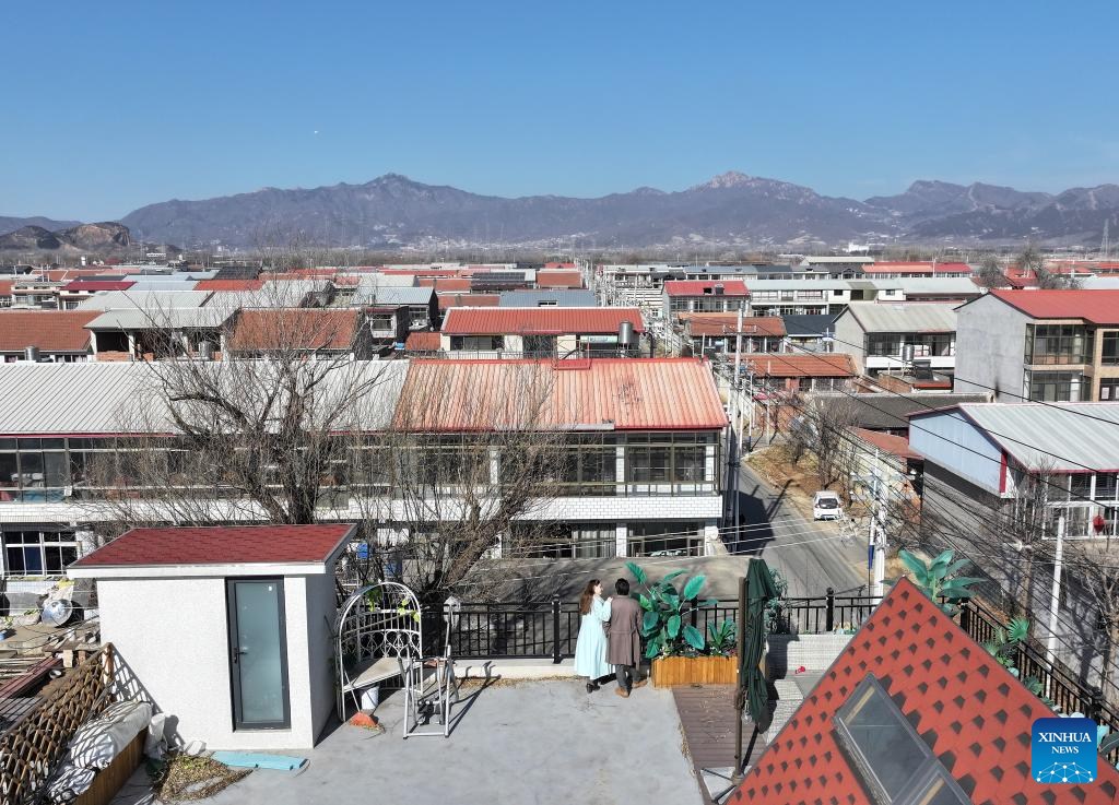 A drone photo taken on Jan. 19, 2025 shows Sara Tentori and her husband Li Jian talking at their homestay in Nanying Village, Guanzhuang Town, Jizhou District, north China's Tianjin. (Xinhua/Li Ran)