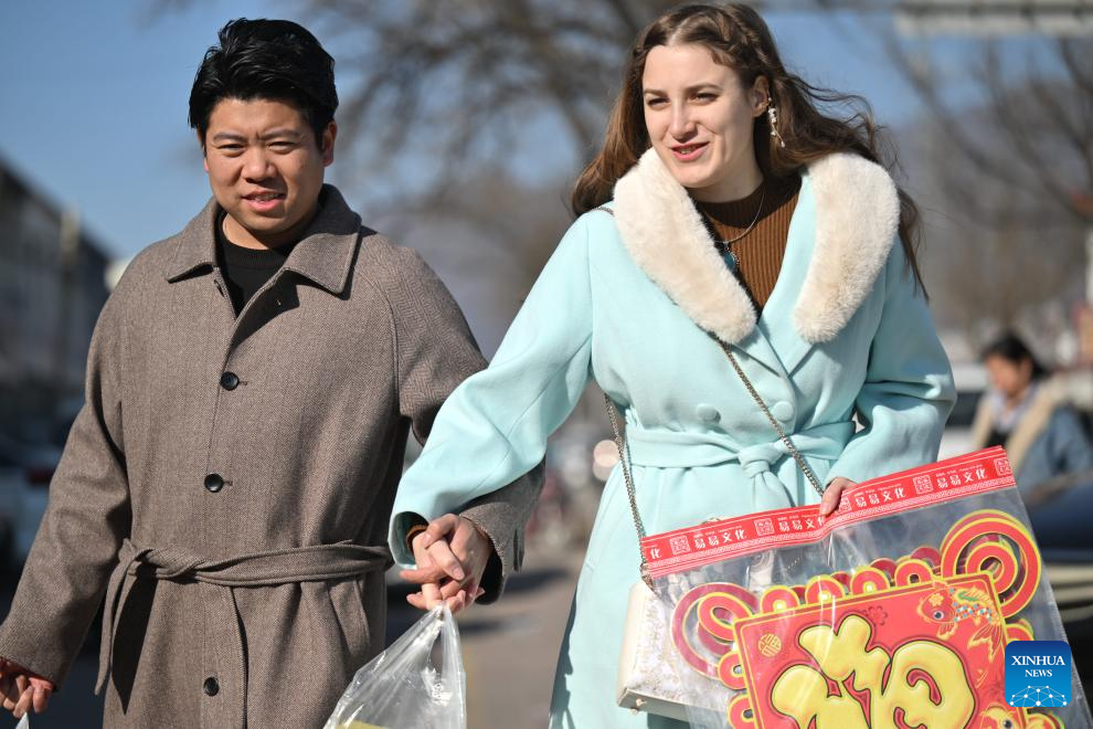 As the Spring Festival nears, the couple are immersing themselves in traditional festive atmosphere by shopping at local Spring Festival market for New Year.