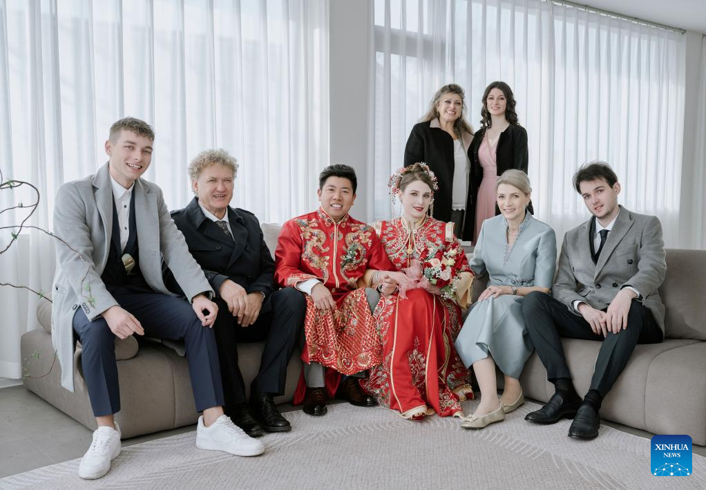 Li Jian (3rd, L) and Sara Tentori (4th, L) pose for a wedding photo with their family members and friends in Nanying Village, Guanzhuang Town, Jizhou District, north China's Tianjin, March 31, 2024. (Xinhua)