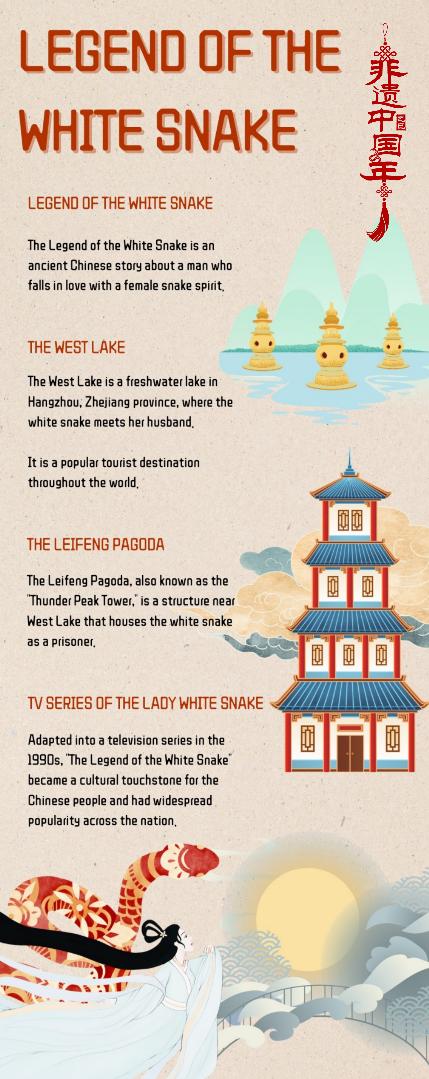 The White Snake Legend is a Chinese legend about a romance between Xu Xian (許仙), a man, and Bai Suzhen (白素貞), a female snake spirit. With a history spanning over centuries, it is considered one of the Four Great Folklores of China. Lady White Snake is well-known in China, and her story was made into a successful 1990s television series.
