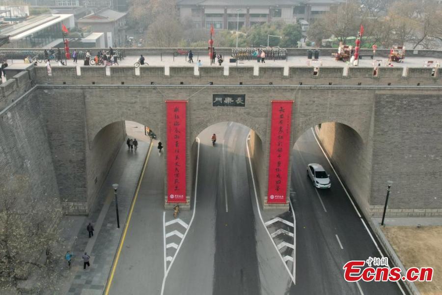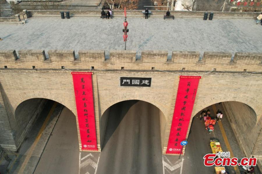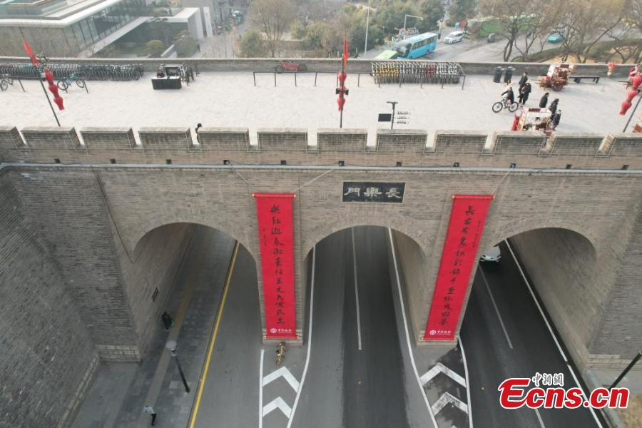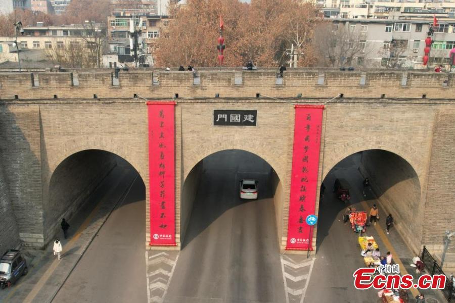 A large couplet is hung on the ancient city wall in Xi'an, northwest China's Shaanxi Province, to greet the upcoming Spring Festival, Jan. 21, 2025. (China News Service/Zhang Yuan)
