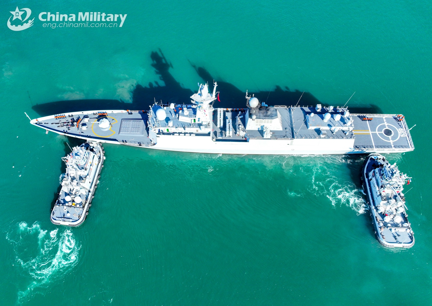 Two tugboats attached to a destroyer flotilla with the navy under the Chinese PLA Northern Theater Command assist the Type-054A guided missile frigate Wuhu (Hull 539) in unberthing operation during a maritime training exercise on January 2, 2025. (eng.chinamil.com.cn/Photo by Ma Yubin)