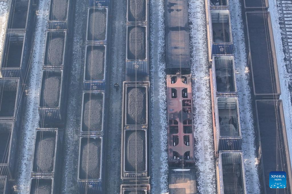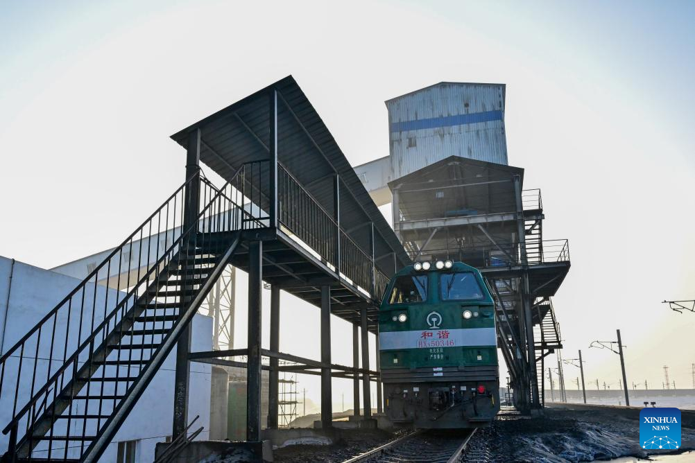 A freight train gets loaded with coal at a loading station at the Zhundong open-pit coal mine of Xinjiang Zhundong Energy Co., Ltd. of China Energy Group, in northwest China's Xinjiang Uygur Autonomous Region, Jan. 21, 2025. By increasing the number of freight trains, the speed of trains, the load of trains and other measures, the Xinjiang railway has made every effort to ensure efficient coal transportation for the upcoming Spring Festival. (Xinhua/Ding Lei)