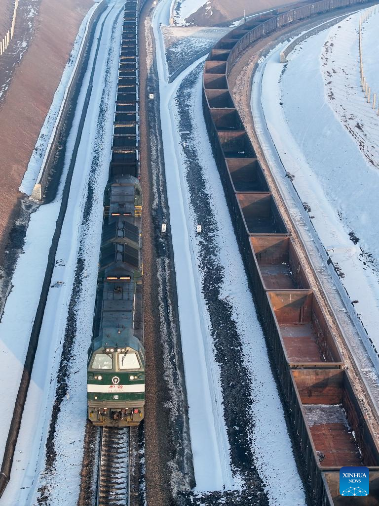 A drone photo shows a freight train loaded with coal running on a railroad in northwest China's Xinjiang Uygur Autonomous Region, Jan. 21, 2025. By increasing the number of freight trains, the speed of trains, the load of trains and other measures, the Xinjiang railway has made every effort to ensure efficient coal transportation for the upcoming Spring Festival. (Xinhua/Ding Lei)