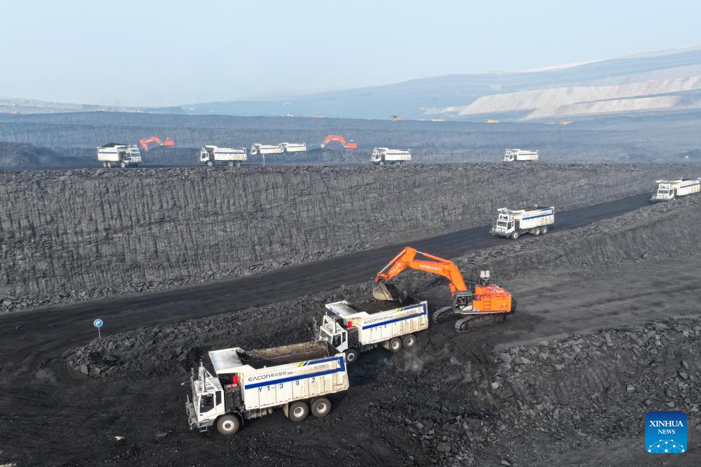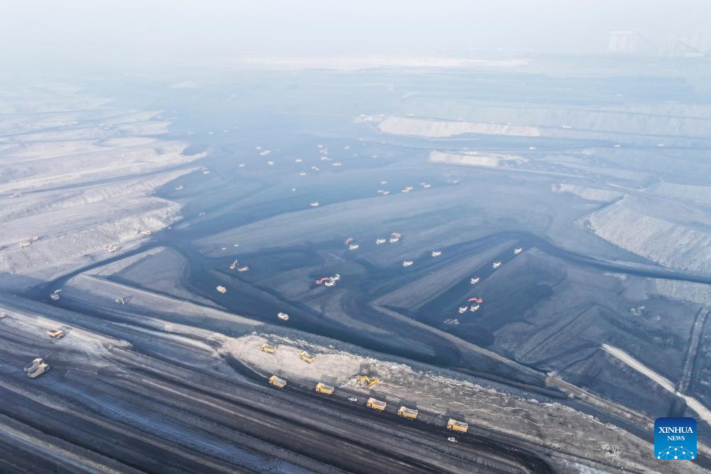 A drone photo shows unmanned mining trucks working at an open-pit coal mine in Zhundong economic and technological development zone, northwest China's Xinjiang Uygur Autonomous Region, Jan. 20, 2025. By increasing the number of freight trains, the speed of trains, the load of trains and other measures, the Xinjiang railway has made every effort to ensure efficient coal transportation for the upcoming Spring Festival. (Xinhua/Ding Lei)