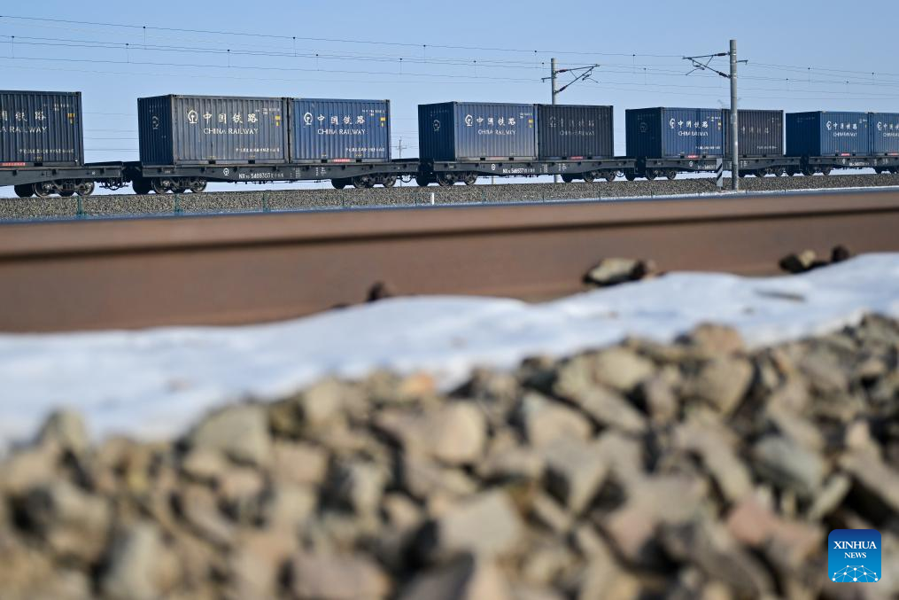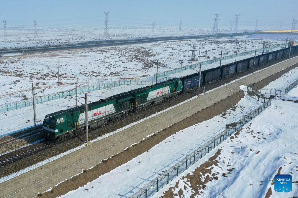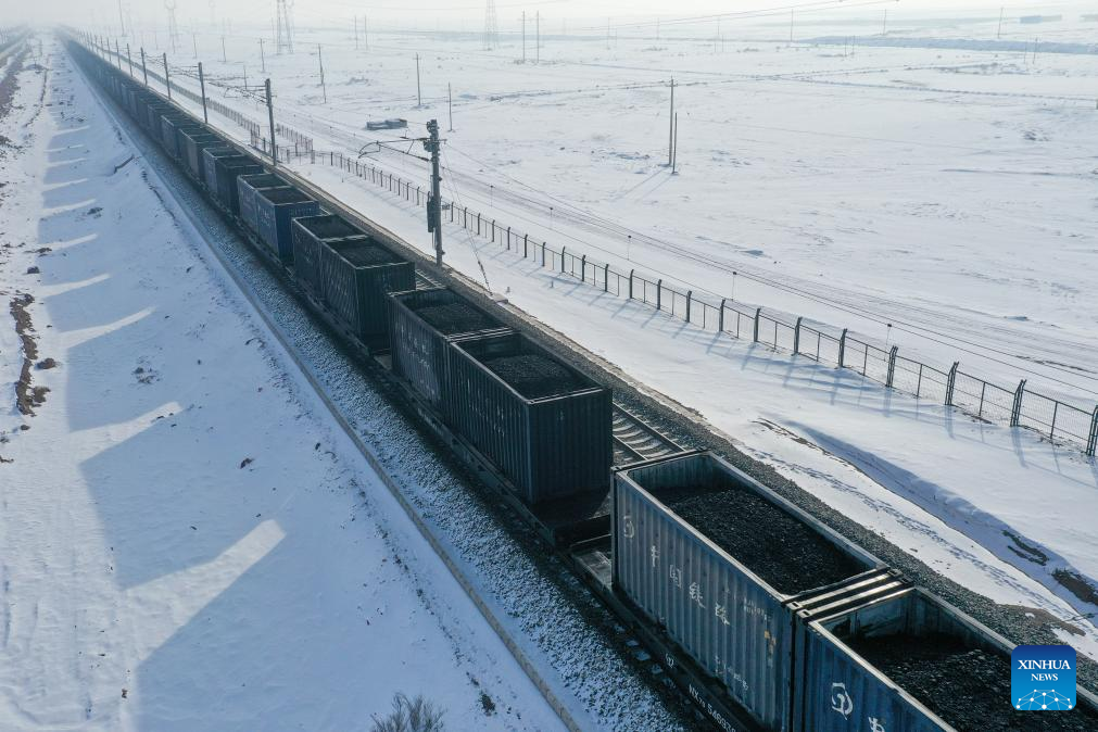 A freight train loaded with coal runs on a railroad in northwest China's Xinjiang Uygur Autonomous Region, Jan. 21, 2025. By increasing the number of freight trains, the speed of trains, the load of trains and other measures, the Xinjiang railway has made every effort to ensure efficient coal transportation for the upcoming Spring Festival. (Xinhua/Ding Lei)