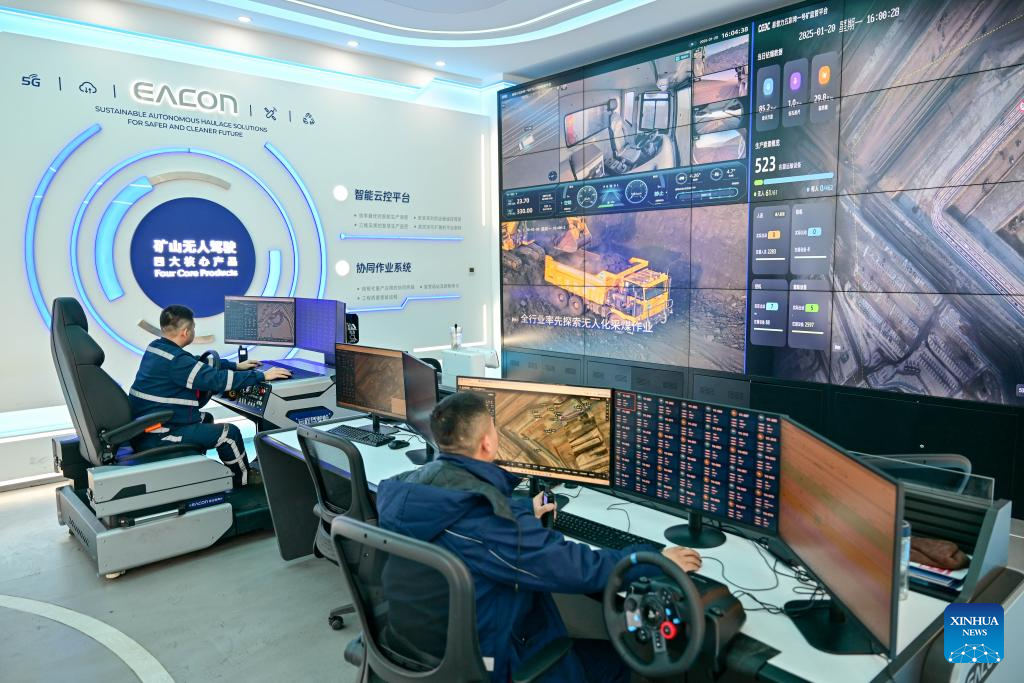 Staff members work at the intelligent cloud control center of an open-pit coal mine in Zhundong economic and technological development zone, northwest China's Xinjiang Uygur Autonomous Region, Jan. 20, 2025. By increasing the number of freight trains, the speed of trains, the load of trains and other measures, the Xinjiang railway has made every effort to ensure efficient coal transportation for the upcoming Spring Festival. (Xinhua/Ding Lei)
