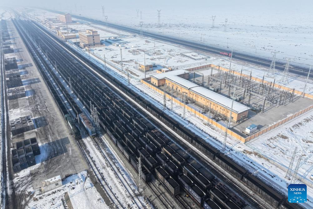 An aerial drone photo taken on Jan. 21, 2025 shows freight trains loaded with coal at Jiangjunmiao railway station in northwest China's Xinjiang Uygur Autonomous Region. By increasing the number of freight trains, the speed of trains, the load of trains and other measures, the Xinjiang railway has made every effort to ensure efficient coal transportation for the upcoming Spring Festival. (Xinhua/Ding Lei)