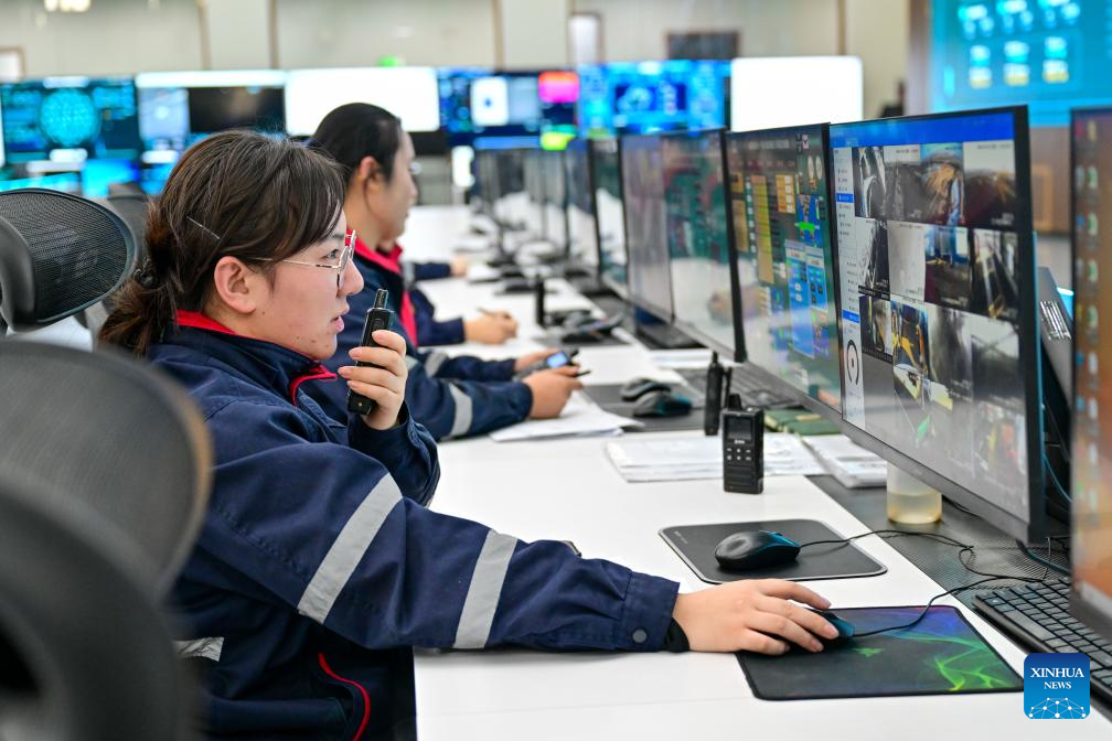 Staff members work at the intelligent control center of a mining company in Zhundong economic and technological development zone, northwest China's Xinjiang Uygur Autonomous Region, Jan. 20, 2025. By increasing the number of freight trains, the speed of trains, the load of trains and other measures, the Xinjiang railway has made every effort to ensure efficient coal transportation for the upcoming Spring Festival. (Xinhua/Ding Lei)