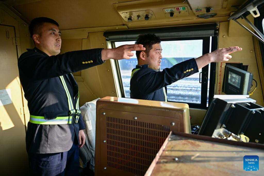 Staff members of a freight train loaded with coal confirm the departure signal at Hongshaquan railway station in northwest China's Xinjiang Uygur Autonomous Region, Jan. 21, 2025. By increasing the number of freight trains, the speed of trains, the load of trains and other measures, the Xinjiang railway has made every effort to ensure efficient coal transportation for the upcoming Spring Festival. (Xinhua/Ding Lei)