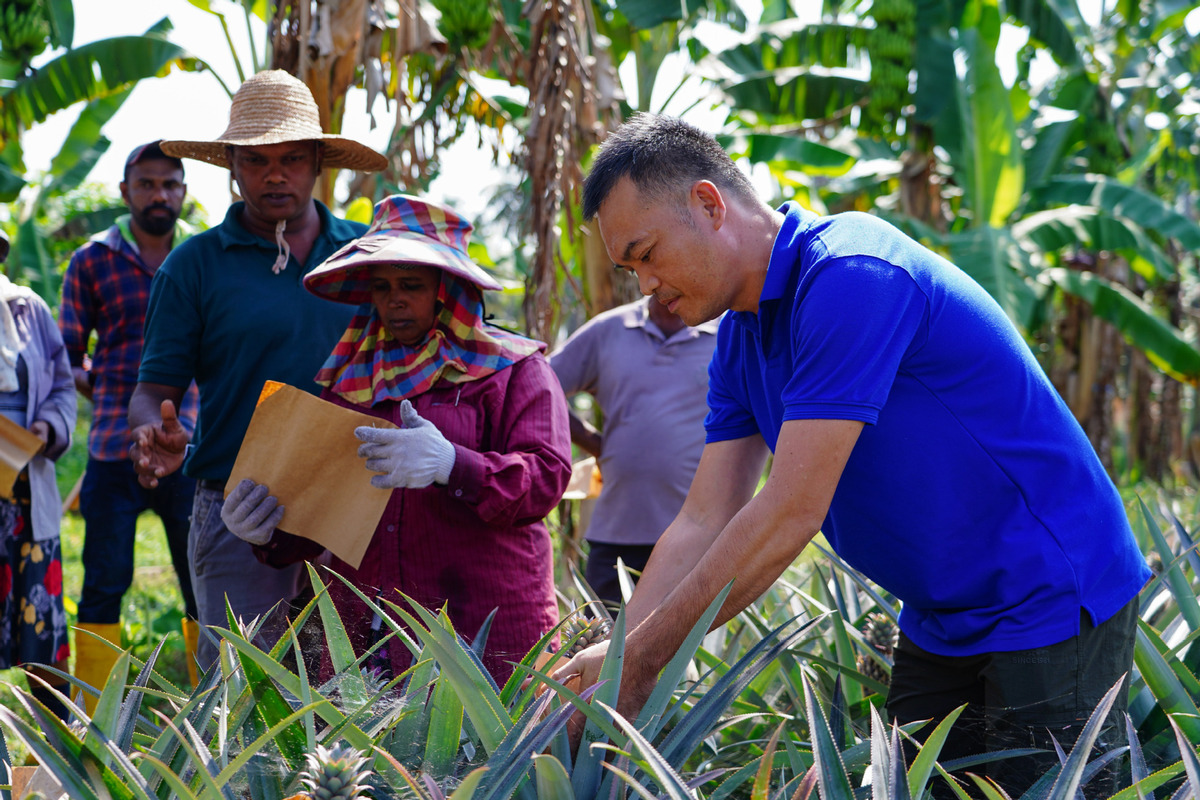 An expert from the Chinese Academy of Tropical Agricultural Sciences demonstrates fruit bagging technology in Makandura, Sri Lanka, on Dec 23, 2024. (Photo/Xinhua)