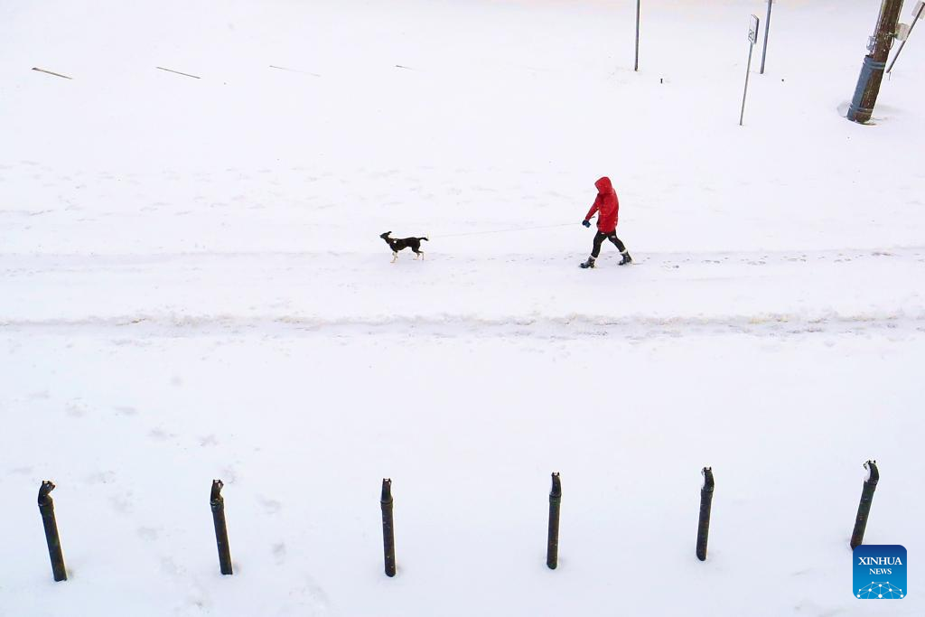 A woman walks a dog in the snow in New Orleans, Louisiana, the United States, on Jan. 21, 2025. A rare winter storm, known as Enzo, has swept through the southern U.S. with record-breaking snow and bitterly cold weather to typically mild regions along the Gulf Coast, claiming at least nine lives as of Wednesday morning. New Orleans, the biggest city in coastal state Louisiana, on Tuesday experienced its heaviest snowfall since 1948, with 8 inches falling in a single day, far surpassing the previous record of 2.7 inches, according to a report from the weather.com on Wednesday. (Photo by Lan Wei/Xinhua)